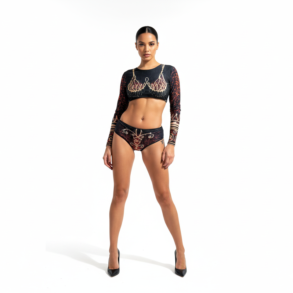 Dive into tan-through smart swimsuits featuring a stylish feather print. This file showcases a swim top with sleeves that dries instantly, as showcased at NYFW. Discover fashion-forward beachwear now!